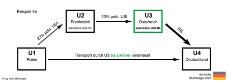 Der deutsche Unternehmer U1 (=erster Lieferer) verrechnet die bestellte Ware an den österreichischen Unternehmer U2 (=1. Abnehmer). Die Ware gelangt aber direkt an den polnischen Empfänger U4 (=letzter Abnehmer).